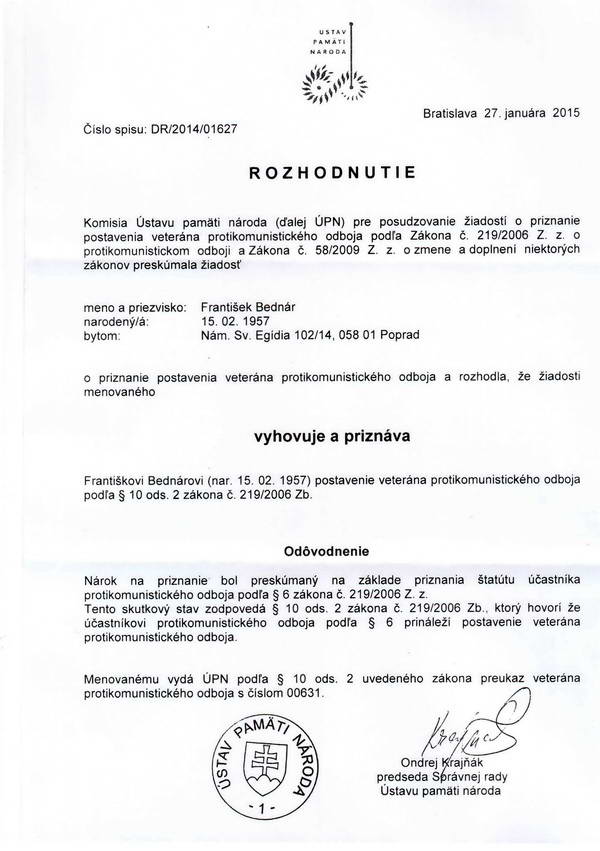![]() Zákon o protikomunistickom odboji §2 Protikomunistický odboj (1) Protikomunistický odboj bol pokračovaním národného boja za oslobodenie. (2) Pod protikomunistickým odbojom sa rozumie aktívny odpor občanov proti komunistickému režimu prejavený či prejavovaný organizovane alebo individuálne v období od 6. októbra 1944 do 17. novembra 1989 §5 Člen ilegálnej organizácie (1) Účastníkom protikomunistického odboja je občan, ktorý v rozhodnom období bol členom ilegálnej organizácie alebo skupiny aktívne bojujúcej proti komunistickému režimu. Protikomunistický odboj v ČSSR v čase normalizácie Protikomunistický odboj na Slovensku -- Popradská skupina |