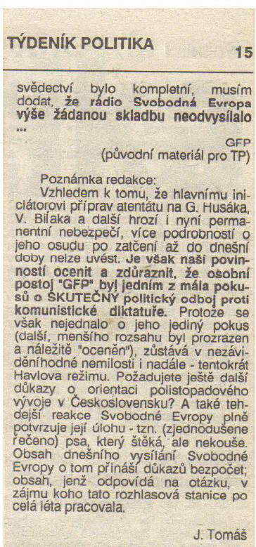 Ovplyvnení vysielaním RFE sme podľahli ilúzii a zidealizovaniu tejto americkej rozhlasovej stanice. Žili sme v presvedčení, že ak sa nájde niekto, kto podporí naše odhodlanie v mene národa a ideálov slobody bojovať za spravodlivú vec, môžu to byť práve naši krajania v Mníchove. To boli dôvody pre ktoré sme sa rozhodli stretnúť práve s niekým s RFE. Závažnosť nášho zámeru si vyžadovala aby o ňom vedel čo najužší okruh osôb. Zvolili sme preto osobný kontakt formou všeobecného rozhovoru, kde som mal oťukať partnera a požiadať ho o sprostredkovanie stretnutia so zástupcom spravodajskej služby. Pri stretnutí som mal zistiť aká bude reakcia na náš návrh ponúknuť spoluprácu spravodajskej službe. Aké využiteľné dispozície v súvislosti s naším návrhom, som chcel podložiť mojím zaradením v armáde ako spojára náčelníka štábu spojovacieho útvaru ako aj osobné kontakty s niekoľkým dôstojníkmi armády a pôsobenie Pavla P., v rámci náhradnej vojenskej služby, v dôležitom prekládkovom železničnom uzle Čierna nad Tisou blízko hranice zo ZSSR, kde mal ideálny prehľad o prejazde vojenských transportov. V tom čase sa začínalo s rozmiestňovaním nukleárnych rakiet stredného doletu na území ČSSR a utajené transporty chodili vždy v noci. Pri pozitívnom prijatí a reálnosti našej spolupráce, som mal potom pristúpiť k nášmu hlavnému zámeru - predostretí návrhu prípravy atentátu. V prípade neúspechu mojej misie sme uvažovali aj o sólovej akcii a nadviazanie kontaktu s emigrantskými kruhmi. Na tom, aký bude výsledok stretnutia závisel môj ďalší postup. Bol som pripravený podriadiť sa požiadavkám našich potencionálnych spojencov v prípade nášho spravodajského využitia a po návrate pôsobiť na území ČSSR alebo v prípade schválenia začatia prípravy atentátu, spolupracovať na organizovaní činnosti Pavla P. v Československu a na túto alternatívu bol pripravený. Moja priama účasť by mohla byť možná tiež po zmene identity, prechodom cez Poľsko s pasom vystaveným na iné meno. Takto vyzeral v hrubých rysoch náš plán, v ktorom navrhovaná špionáž proti ČSSR a alternatívny atentát boli dôkazom nášho odhodlania a vážneho úmyslu zapojiť sa týmto spôsobom do aktívnej antikomunistickej činnosti. Pre úspech akcie sme boli ochotní obetovať všetko. Boli sme však realistami a za úspech by sme pokladali aj nadviazanie spolupráce s rozviedkou. Uvedomovali sme si totiž, že táto bezprecedentná akcia je príliš "horúcim želiezkom" aj pre profesionálov, hlavne kvôli medzinárodnému dosahu a reakcii Varšavského paktu, respektíve KGB. Z toho dôvodu sme rozhodnutie chceli prenechať kompetentným. V júli 1983, po zdĺhavom vybavovaní príslušných formalít, sme spolu s mojou priateľkou, Jarmilou Š., zasvätenou do veci, vycestovali na oficiálne uvedenú svadobnú cestu do Juhoslávie. Táto kamufláž mala upevniť zdanie vierohodnosti nenápadných turistov. Jarmila Š, svojím postavením stredoškolskej profesorky, bola ideálnou diskrétnou spoločníčkou, s ktorou sme tvorili dvojicu, ktorú by sotva niekto podozrieval z postranných úmyslov. Neraz som sa presvedčil, že dokáže mlčať a svojím nenápadným zjavom, skromnej a plachej dievčiny, dokonale maskovala svoje skutočné vnútro, ktoré neodhalili ani neskoršie výsluchy pred štátnou bezpečnosťou. Prvá cesta po príchode do malebného prímorského Rovinju viedla na poštový úrad, odkiaľ sme odoslali prvý telegram tohto znenia: Adresa: Rudolf Janota, 860401, D 8000, München. V záujme našej spoločnej veci, čakám v Rovinji o 21.30 hod., v Key bare, vedľa Jugobanky, každý večer až do 8.augusta. Značka, modré tričko: Gold Fassl Pils. Po niekoľkých dňoch márneho čakania sme pre istotu odoslali ešte jeden telegram rovnakého znenia. Po bezvýslednom čakaní a ťažkom vnútornom zápase, ovplyvnený Jarmilou Š., ktorá kvôli matke nechcela emigrovať, som sa rozhodol pre návrat do Československa. Bolo to najťažšie a ako sa neskôr ukázalo najhoršie rozhodnutie v mojom živote. Nemohol som pochopiť ako mohla celá naša snaha stroskotať na obyčajnej ľudskej pohodlnosti a ľahostajnosti. Na jednej strane plamenné reči v éteri o potrebe odporu proti režimu a na druhej fatálna ignorácia a nezáujem zistiť aspoň dôvod prečo sa niekto naliehavo snaží spojiť s RFE a kvôli čomu to robí. S trpkým pocitom sklamania som odoslal, tým ktorým som veril, pohľadnicu s lakonickým textom: Ukecaným frajerom z rádia Slobodná Európa posiela pozdrav GFP. PP 250 93, čo bola autoznačka mesta, telefónne číslo a môj posledný zúfalý pokus. Zbohom Rovinj, zbohom slnečná Juhoslávia! Lúčil som sa s azúrovým Jadranom netušiac, že onedlho mi bude súdené nevidieť ho dlhé roky. Cesta späť a prechod cez československú hranicu boli deprimujúce a pripadali mi ako účasť na vlastnom pohrebe. Arogantné tváre uniformovaných colníkov a ich psy akoby boli predzvesťou neblahej predtuchy môjho ďalšieho osudu. |