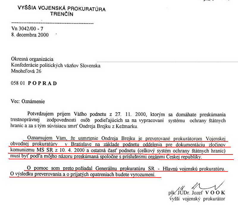Potvrdenie podania Vyššou vojenskou prokuratúrou v Trenčíne