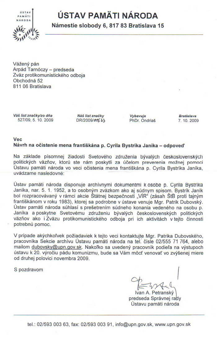 Bohužiaľ, pri plnení „dôležitých úloh“ si ÚPN za dva roky od podania návrhu na očistenie mena nespravodlivo odsúdeného františkána C.B. Janíka nenašiel čas, aby podal GP SR jeden obyčajný návrh. Keď sme po odhalení pamätnej tabule v Liptovskej Tepličke kontaktovali Mgr. Dubovského, ktorý mal mať uvedenú vec pridelenú, tak ten už medzičasom v ÚPN ani nepracoval. O návrhu podrobne informujeme na webovej stránke SZČPV http://www.szcpv.org/09/ocistenie.html