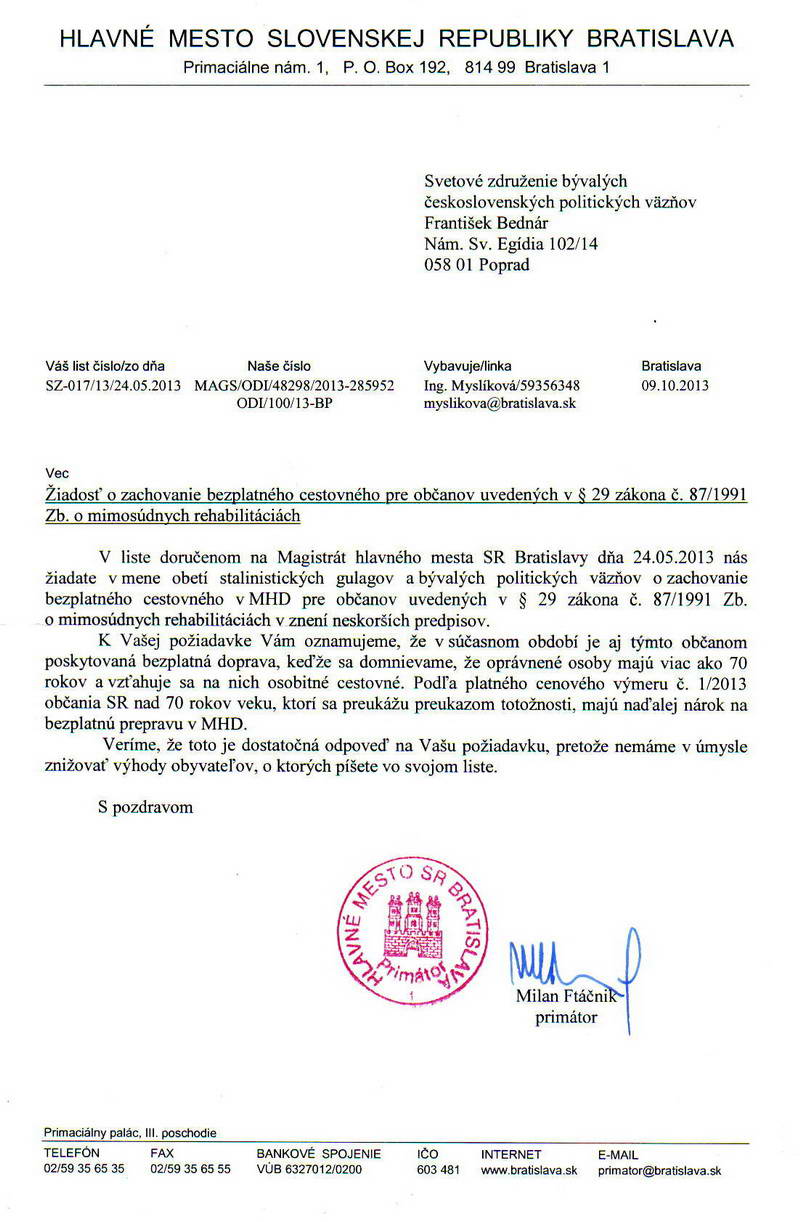 Bratislavský primátor Milan Ftáčnik si konečne po takmer piatich mesiacoch našiel čas napísať odpoveď na žiadosť našej organizácie, ktorou sme sa pokúsili zmeniť rozhodnutie Mesta Bratislava zrušiť zvýhodnené cestovne pre bývalých politických väzňov, vdovy po politických väzňov a priamych príbuzných násilne odvlečených do Gulagov. V žiadosti sme poukázali na neľahkú sociálnu situáciu obeti, ktoré boli znevýhodňované v čase totality a bezplatné cestovné bolo jedným z posledných zvýhodnení, ktoré boli prijaté po novembri 1989. Taktiež sme poukázali na susedné Maďarsko, kde napriek kríze všetci občania nad 65 rokov, dokonca aj občania EÚ, teda aj Slovenska, cestujú v MHD bezplatne. SVETOVÉ ZDRUŽENIE BÝVALÝCH ČESKOSLOVENSKÝCH POLITICKÝCH VÄZŇOV So sídlom v Slovenskej Republik Nám. Sv. Egídia 102/14, 058 01 Poprad doc. RNDr. Milan FTÁČNIK, CSc. primátor hlavného mesta SR Bratislavy
