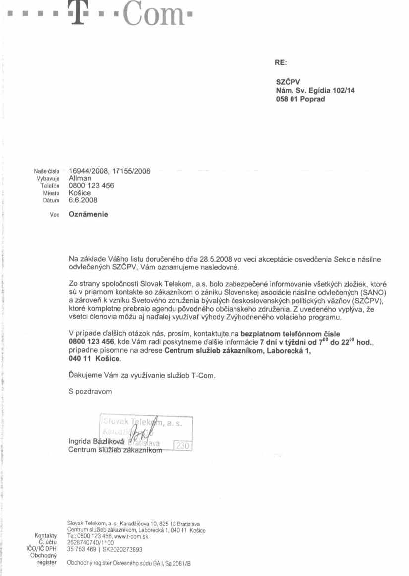 Oznámenie spoločnosti T-Com o akceptovaní osvedčení Sekcie násilne odvlečených SZČPV