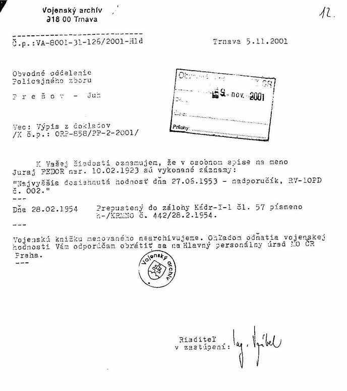 Doklad Vojenského archívu v Trnave č.p.:VA-8001-31-126/2001-Hid zo dňa 9.11.2001 Doklad štátneho ústredného archívu v Prahe č.4457/04-02 zo dňa 21.11.02