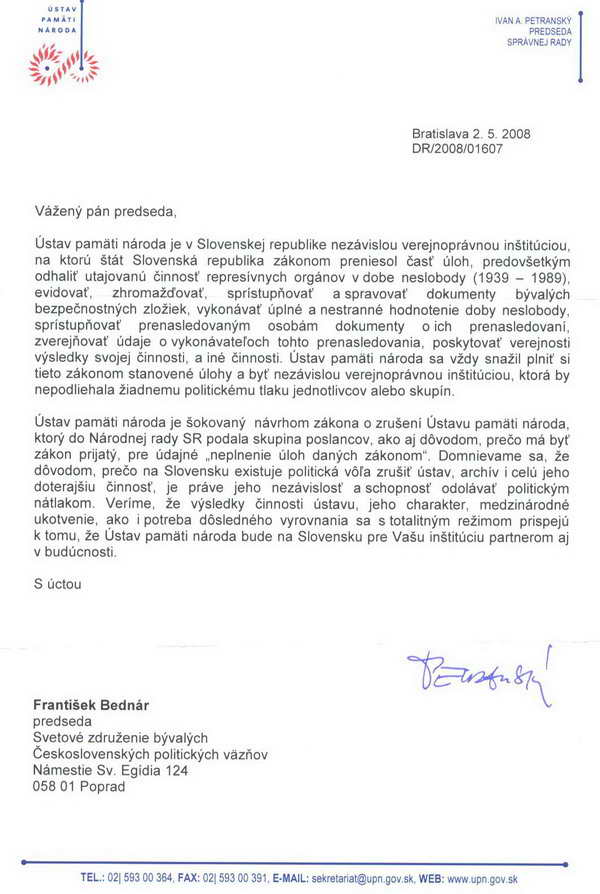 Otvorený list Svetového združenia bývalých čsl. politických väzňovSTANOVISKO K NÁVRHU ZÁKONA O ZRUŠENÍ ÚPNVážení poslanci klubu SNS Svetové združenie bývalých čsl. politických väzňov (SZČPV) ako najstaršia organizácia združujúca bývalých politických väzňov, účastníkov odboja a obete nacistického a komunistického totalitného režimu, ktorá vznikla v roku 1968 vo Švajčiarsku a v súčasnosti pôsobí ako sídelná organizácia v Slovenskej republike, na podnet viacerých našich členov žijúcich v zahraničí, Vás žiada o späťvzatie návrhu poslancov NR SR Jána SLOTU, Rudolfa PUČÍKA, Jána SLABÉHO a Rafaela RAFAJA na vydanie zákona, ktorým sa zrušuje zákon č. 553/2002 Z. z. o sprístupnení dokumentov o činnosti bezpečnostných zložiek štátu 1939 - 1989 a o založení Ústavu pamäti národa a o doplnení niektorých zákonov (zákon o pamäti národa) v znení neskorších predpisov. Odôvodnenie: Napriek tomu, že naša organizácia mala už od vzniku ÚPN zásadne výhrady k nedemokratickému výberu kandidátov do správnej a dozornej rady ÚPN, v ktorej mali minimálne zastúpenie býv. politickí väzni a úplne žiadne členovia SZČPV, považujeme existenciu ÚPN za prospešnú z viacerých všeobecne známych dôvodov. V minulosti sme kriticky vystupovali aj k samotnej činnosti ÚPN pod vedením nebohého Ing. Jána Langoša. Poukazovali sme predovšetkým na podstatný fakt, že agentúra KGB a ŠtB sa po novembri 1989 úspešne pretransformovala do najvplyvnejších ekonomických, finančných aj mediálnych štruktúr v celom bývalom Československu. Podľa dohody v duchu zamatového scenára nesmeli byť 15 rokov zverejnené mená príslušníkov I. správy ŠtB. Všeobecne bolo známe len to, že bývalý hlavný veliteľ komunistickej ŠtB odsúdený v ČR, pôsobil na úseku informačných a zabezpečovacích systémov vo finančnej (rusko-slovensko-českej) skupine, ktorej filiálka Vinako stála aj za (dnes toľko pertraktovaným) predajom Slovenského plynárenského priemyslu. V ČR boli oneskorene oficiálne uznané tzv. Cibulkové zoznamy spolupracovníkov ŠtB s právnou relevanciou. Ani po vstupe SR do NATO sa v odhaľovaní utajovaných zložiek totalitného štátu (čo je podľa zákona prioritou ÚPN), nedosiahlo to, čo v susednej ČR. Prioritou ÚPN malo byť totiž nielen odhaľovanie hlavných vinníkov, ktorí sa podieľali na represívnom aparáte KSČ, ale aj nestranné hodnotenie doby neslobody, čo sa nestalo. ÚPN sa naopak, čoraz viac dostával pod vplyv politických protežantov, čo vyvrcholilo škandálom, ktorý odhalili české médiá, keď manželku expredsedu ÚPN pristihli v okrajovej štvrti Prahy s dvomi miliónmi ČK v kabelke! Nie je známe napríklad ani to, kam sa podeli archívne Bohužiaľ situácia sa zásadne nezmenila ani po nástupe Ing. I. Petranského na post predsedu správnej rady ÚPN. Nezainteresovanému by sa mohlo zdať, že ÚPN začal aktívnu činnosť v odhaľovaní nevyšetrených vrážd kňazov a obetí na hraniciach. Prakticky je však táto činnosť ÚPN len symbolická, pretože je všeobecne známe, že po novembrovom prevrate u nás (na rozdiel od denacifikácie Nemecka po páde nacistického režimu), nedošlo k deboľševizácii spoločnosti, ale naopak ku kontinuite komunistického právneho systému a preto neexistujú podmienky na ukončenie vecí vynesením právoplatného rozsudku. “ Predseda Správnej rady ÚPN cynicky traumatizuje obeť stalinistického Gulagu“http://www.szcpv.org/07/upn/korpas.html Predseda správnej rady ÚPN Ivan Petranský nesie priamu zodpovednosť aj za neprofesionalitu svojich podriadených, ktorí v duchu predchádzajúceho princípu politickej inklinácie zverejňovali mediálne pikošky, namiesto zdokumentovanej faktografie o skutočných zločincoch totalitného režimu, čím činnosť ÚPN degradovali na úroveň bulváru. Je poľutovaniahodné, že takej medializácie ako sa dostalo prípadu dnes už nebohého otca predsedu SNS a jeho samotného, sa nedostalo skutočným prominentnom z radov VKR a ŠtB. Od ÚPN sa občania nikdy nedozvedeli ani len takú elementárnu informáciu, k akým záverom došlo vyšetrovanie „samovraždy“ agenta KGB a bývalého komunistického predsedu SNR Viliama Šalgoviča, či ako dopadli previerky bývalých agentov ŠtB, ktorí dnes suverénne pôsobia v rôznych ekonomických štruktúrach štátu. Občania sú však nadštandartne informovaní o mladíckej nerozvážnosti 17 ročného chlapca, ktorý je dnes pronárodne orientovaným politikom. Je potrebné rozlišovať hlavné od balastu. Ani v takých USA sa témou č. 1. v médiách nestala spolupráca finančníka Prescota Busha, starého otca G. W. Buscha s nacistami pri prepieraní ich zlata a peňazí ešte aj dlhý čas po vojne. A to je o niečom úplne závažnejšom! Na vedomie: Poslanecký klub SNS
