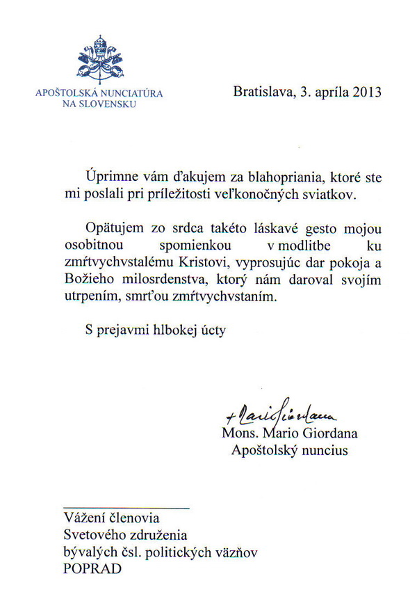 Poďakovanie Apoštolského nuncia Mons. Maria Giordana