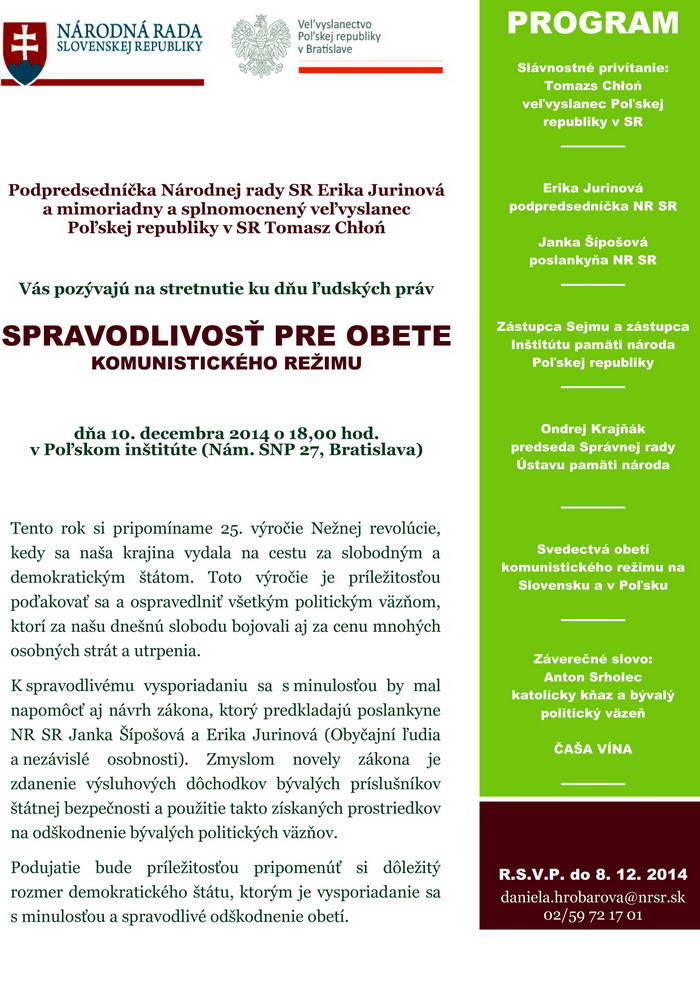 z poverenia pani podpredsedníčky NR SR Eriky Jurinovej si Vás dovoľujem pozvať na podujatie ku Dňu ľudských práv Spravodlivosť pre obete komunistického režimu, ktoré sa uskutoční v stredu 10. decembra 2014 o 18:00 hod. v Poľskom inštitúte (Nám. SNP 27, Bratislava). Podrobnejšie informácie sú v priloženej pozvánke spolu s programom podujatia.