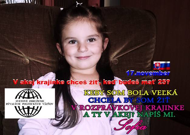 Naša kampaň pre zapájanie mladých ľudí do verejnej diskusie k prehlbovaniu "slobody, demokracie, ľudských práv - 17. november" je založená na názore malej Sofii, narodenej v novembri, ktorá by chcela, ak bude veľká, žiť v rozprávkovej krajinke, kde dobro víťazí nad zlom. Tak si aj my každý rok pripomíname 17.novembra Medzinárodný deň študentstva a Deň boja za slobodu a demokraciu - štátny sviatok.