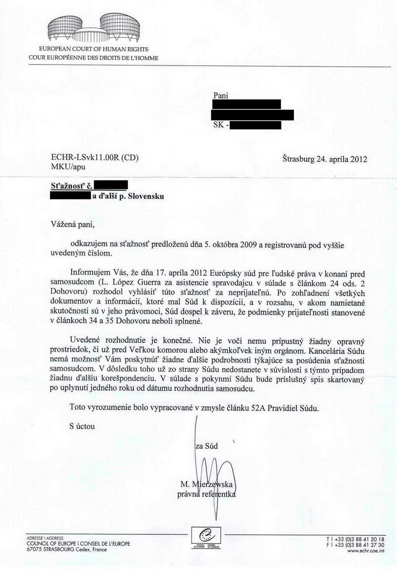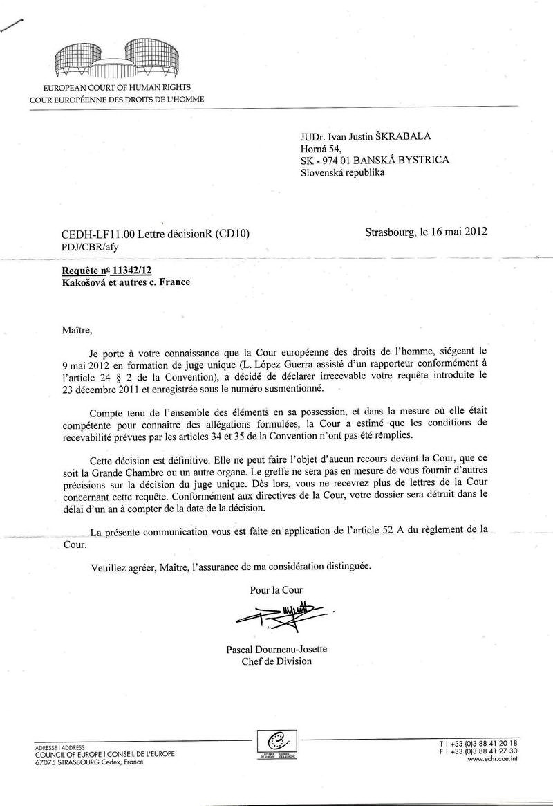 Informujem Vás, že dňa 9. Mája 2012 Európsky súd pre pre ľudské práva v konaní pred samosudcom (L. Lôpez za asistencie spravodajcu v súlade s článkom 24 ods. 2 Dohovoru) rozhodol vyhlásiť sťažnosť predloženú dňa 23 decembra 2011 za neprijateľnú. Po zohľadnené všetkých dokumentov a informácii, ktoré mal súd k dispozícii, súd dospel k záveru, že podmienky prijateľnosti stanovené v článkoch 34 a 35 Dohovoru neboli splnené.