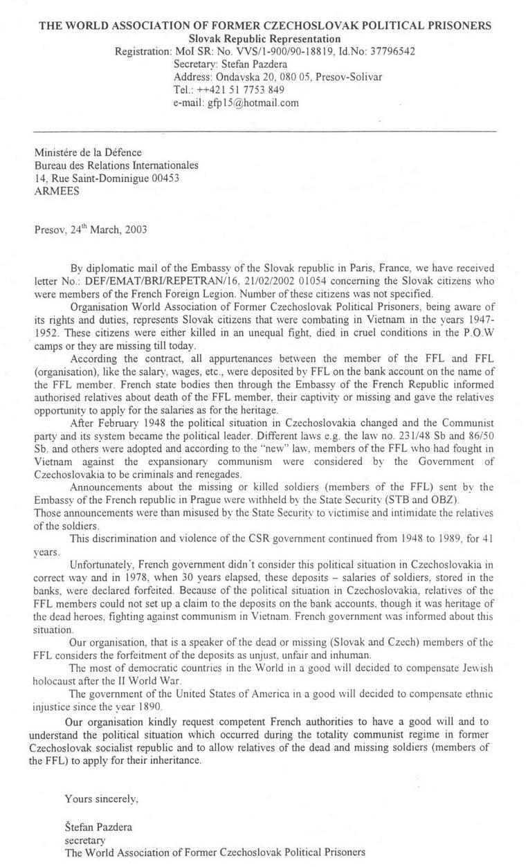 neakceptujú existenciu železnej opony a marenie uplatnenia týchto pohľadávok zo strany komunistickej tajnej polície, SZČPV pripravuje žiadosť pre prezidenta a vládu Francúzska s návrhom na prijatie opatrení na spravodlivú kompenzáciu pre oprávnené osoby tak ako to mu bolo v prípade odškodnenia obetí nútených prác v čase II. Sv. vojny.
